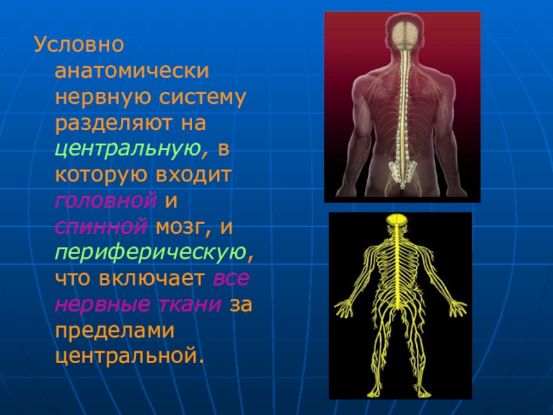 Условно анатомически нервную систему разделяют на центральную, в которую входит головной