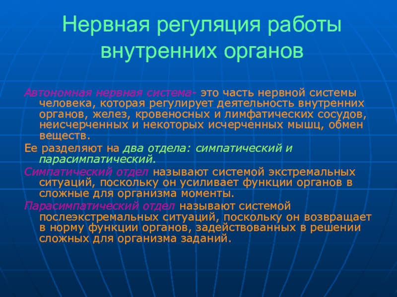 человека, которая регулирует деятельность внутренних органов, желез, кровеносных и лимфатических сосудов, неисчерченных и некоторых исчерченных мышц, обмен веществ.