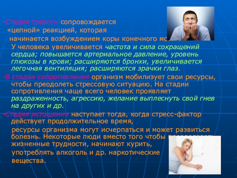 В реакции человека на действие стрессовых факторов выделяют три стадии: стадия тревоги, стадия сопротивления, стадия истощения.