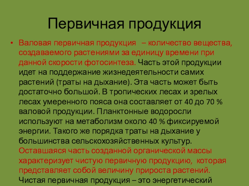 единицу времени при данной скорости фотосинтеза. Часть этой продукции идет на поддержание жизнедеятельности самих растений (траты на дыхание). Эта часть может быть достаточно большой. В тропических лесах и зрелых лесах умеренного пояса она составляет от 40 до 70 % валовой продукции. Планктонные водоросли используют на метаболизм около 40 % фиксируемой энергии. Такого же порядка траты на дыхание у большинства сельскохозяйственных культур. Оставшаяся часть созданной органической массы характеризует чистую первичную продукцию, которая представляет собой величину прироста растений. Чистая первичная продукция – это энергетический резерв для консументов и редуцентов.