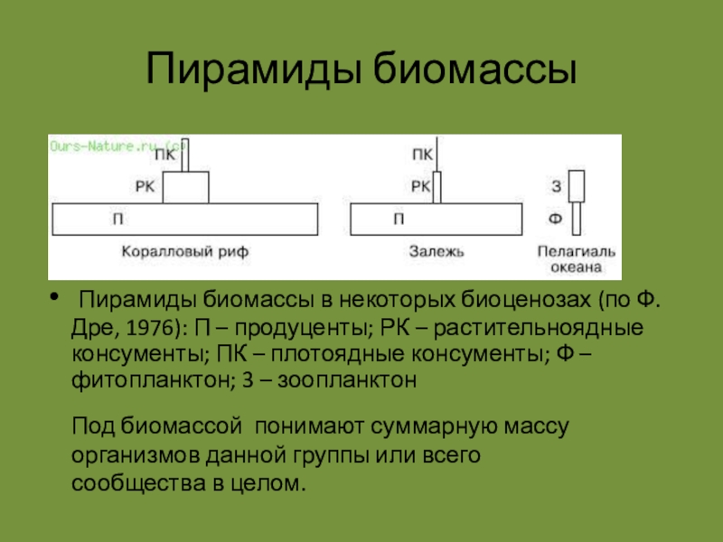 Пирамиды биомассы в некоторых биоценозах (по Ф. Дре,