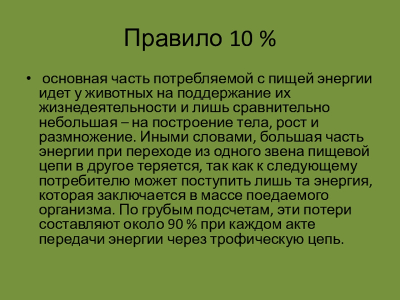 животных на поддержание их жизнедеятельности и лишь сравнительно небольшая – на построение тела, рост и размножение. Иными словами, большая часть энергии при переходе из одного звена пищевой цепи в другое теряется, так как к следующему потребителю может поступить лишь та энергия, которая заключается в массе поедаемого организма. По грубым подсчетам, эти потери составляют около 90 % при каждом акте передачи энергии через трофическую цепь.