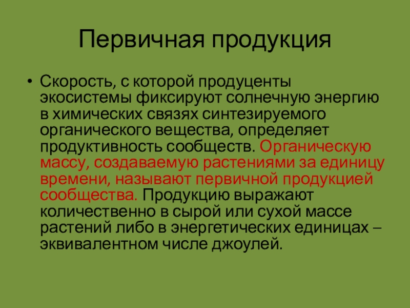 связях синтезируемого органического вещества, определяет продуктивность сообществ. Органическую массу, создаваемую растениями за единицу времени, называют первичной продукцией сообщества. Продукцию выражают количественно в сырой или сухой массе растений либо в энергетических единицах – эквивалентном числе джоулей.