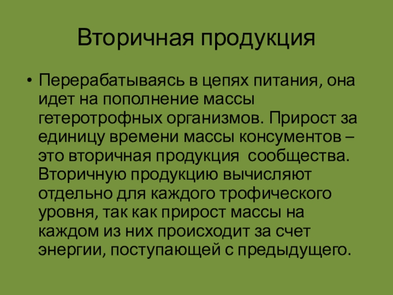 организмов. Прирост за единицу времени массы консументов – это вторичная продукция сообщества. Вторичную продукцию вычисляют отдельно для каждого трофического уровня, так как прирост массы на каждом из них происходит за счет энергии, поступающей с предыдущего.