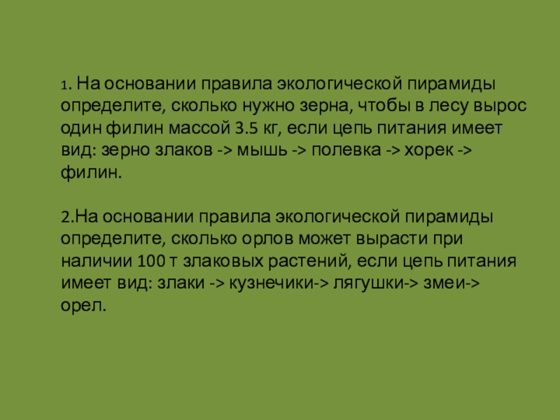 Слайд 301. На основании правила экологической пирамиды определите, сколько нужно зерна, чтобы