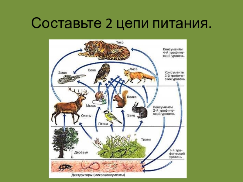 Таким образом, различают консументов первого, второго и третьего порядков, занимающих разные уровни в цепях питания.