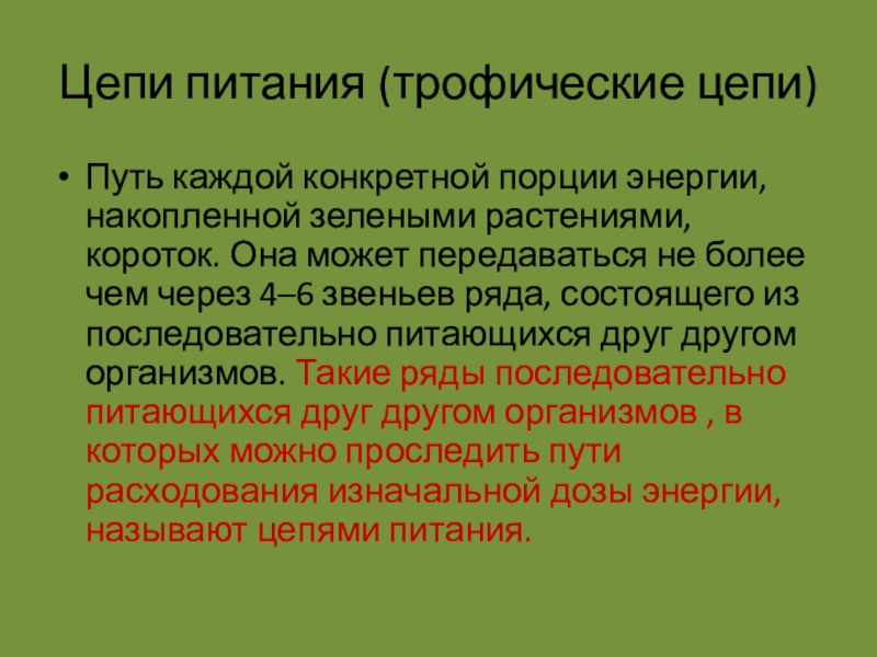 короток. Она может передаваться не более чем через 4–6 звеньев ряда, состоящего из последовательно питающихся друг другом организмов. Такие ряды последовательно питающихся друг другом организмов , в которых можно проследить пути расходования изначальной дозы энергии, называют цепями питания.