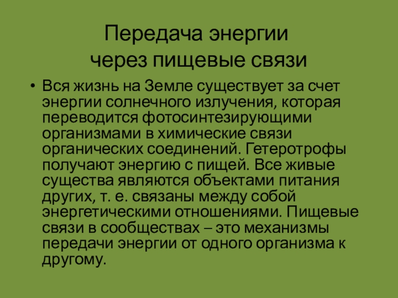 энергии солнечного излучения, которая переводится фотосинтезирующими организмами в химические связи органических соединений. Гетеротрофы получают энергию с пищей. Все живые существа являются объектами питания других, т. е. связаны между собой энергетическими отношениями. Пищевые связи в сообществах – это механизмы передачи энергии от одного организма к другому.