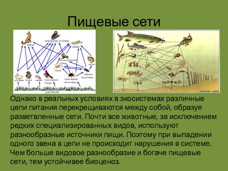 собой, образуя разветвленные сети. Почти все животные, за исключением редких специализированных видов, используют разнообразные источники пищи. Поэтому при выпадении одного звена в цепи не происходит нарушения в системе. Чем больше видовое разнообразие и богаче пищевые сети, тем устойчивее биоценоз.