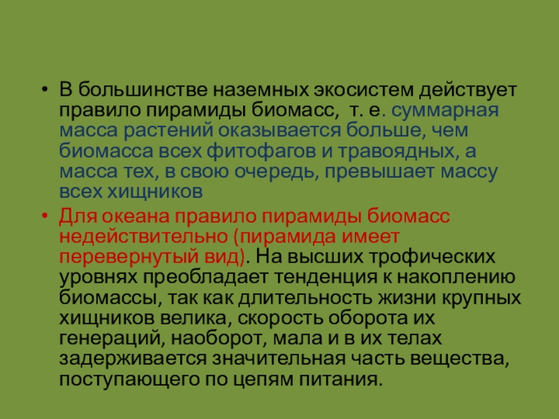 масса растений оказывается больше, чем биомасса всех фитофагов и травоядных, а масса тех, в свою очередь, превышает массу всех хищников