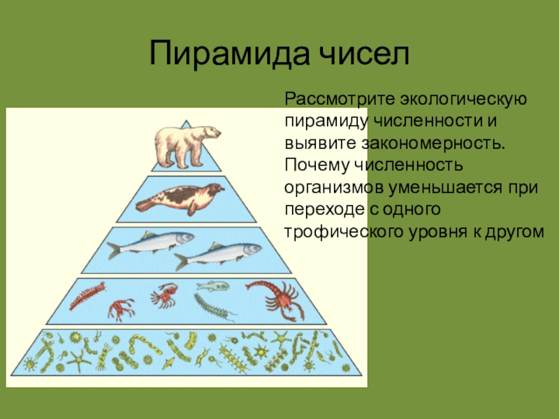Рассмотрите экологическую пирамиду численности и выявите закономерность. Почему численность организмов