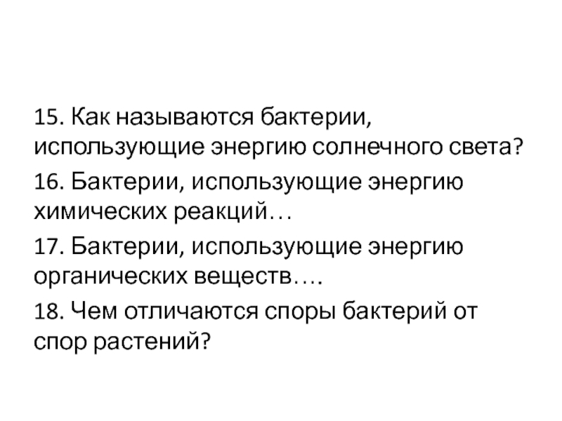 15. Как называются бактерии, использующие энергию солнечного света?16. Бактерии, использующие энергию химических реакций…17. Бактерии, использующие энергию органических