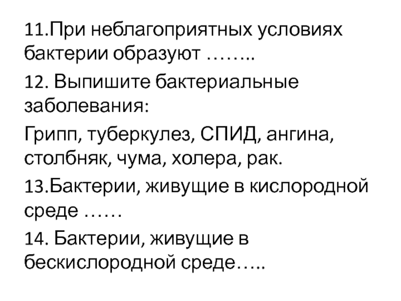 11.При неблагоприятных условиях бактерии образуют ……..12. Выпишите бактериальные заболевания:Грипп, туберкулез, СПИД, ангина, столбняк, чума, холера, рак.13.Бактерии, живущие