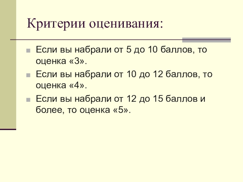 Критерии оценивания:Если вы набрали от 5 до 10 баллов, то оценка «3».Если вы набрали от 10 до