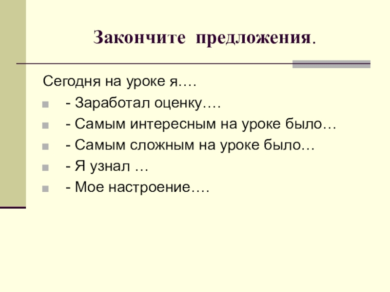 Закончите предложения.Сегодня на уроке я….- Заработал оценку….- Самым интересным на уроке было…- Самым сложным на уроке было…-