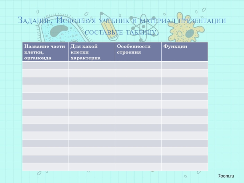 Слайд 7Задание. Рассмотрите модель клетки и назовите все ее части и органоиды.