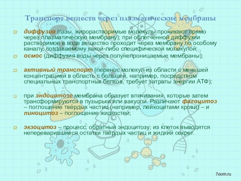 Слайд 13Транспорт веществ через плазматические мембраны