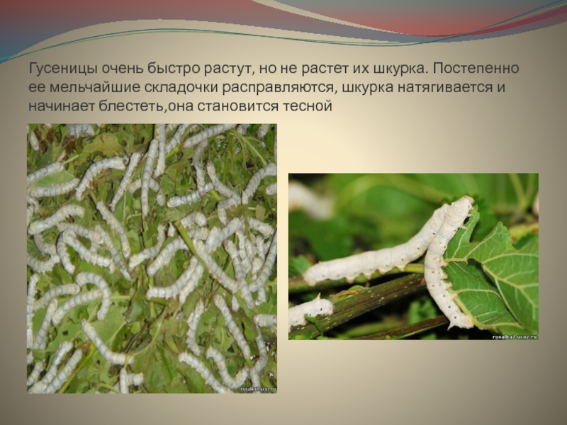 Слайд 6Гусеницы очень быстро растут, но не растет их шкурка. Постепенно ее