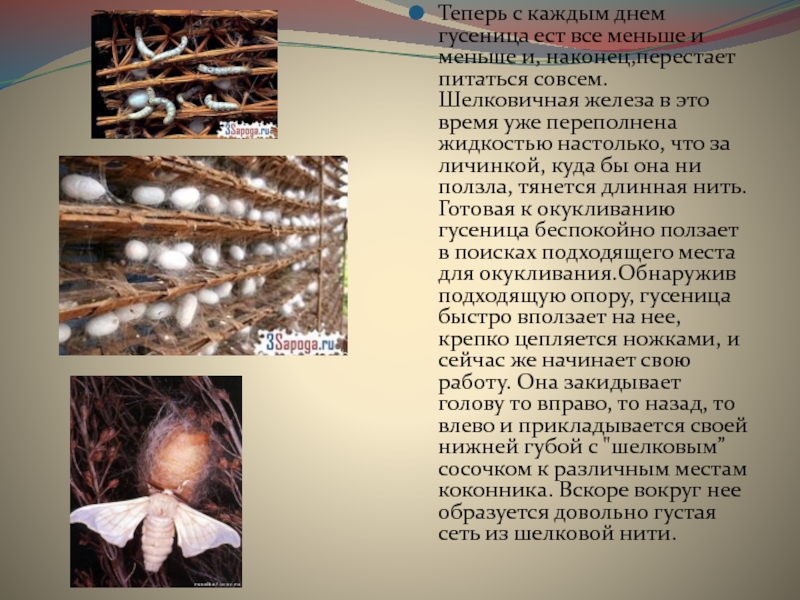 наконец,перестает питаться совсем. Шелковичная железа в это время уже переполнена жидкостью настолько, что за личинкой, куда бы она ни ползла, тянется длинная нить. Готовая к окукливанию гусеница беспокойно ползает в поисках подходящего места для окукливания.Обнаружив подходящую опору, гусеница быстро вползает на нее, крепко цепляется ножками, и сейчас же начинает свою работу. Она закидывает голову то вправо, то назад, то влево и прикладывается своей нижней губой с "шелковым” сосочком к различным местам коконника. Вскоре вокруг нее образуется довольно густая сеть из шелковой нити.