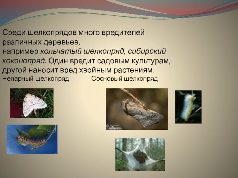 Слайд 14Среди шелкопрядов много вредителей различных деревьев,