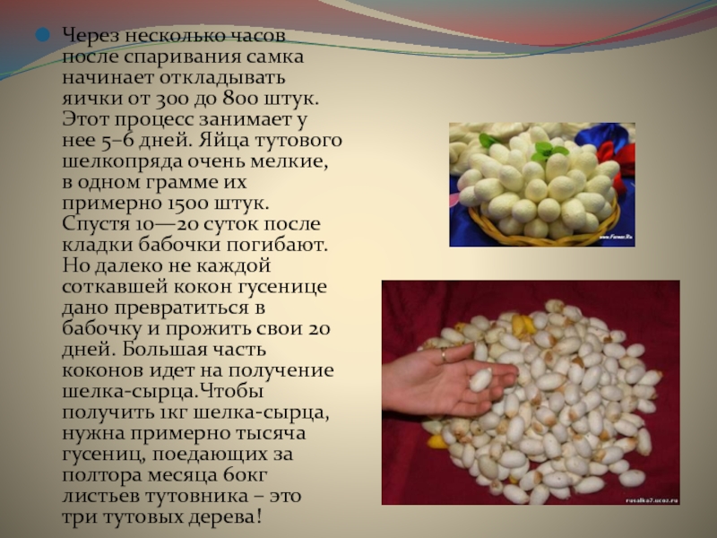 до 800 штук. Этот процесс занимает у нее 5–6 дней. Яйца тутового шелкопряда очень мелкие, в одном грамме их примерно 1500 штук. Спустя 10—20 суток после кладки бабочки погибают.Но далеко не каждой соткавшей кокон гусенице дано превратиться в бабочку и прожить свои 20 дней. Большая часть коконов идет на получение шелка-сырца.Чтобы получить 1кг шелка-сырца, нужна примерно тысяча гусениц, поедающих за полтора месяца 60кг листьев тутовника – это три тутовых дерева!