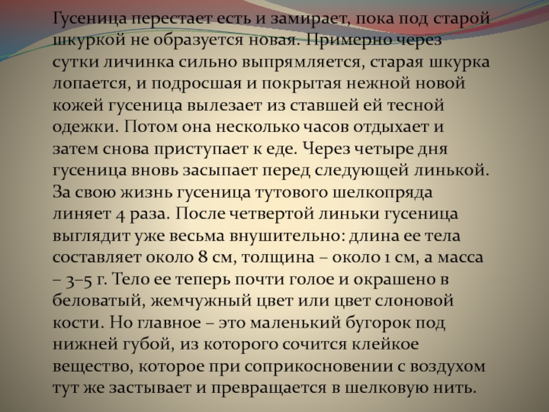 Слайд 7Гусеница перестает есть и замирает, пока под старой шкуркой не образуется