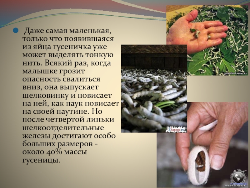 может выделять тонкую нить. Всякий раз, когда малышке грозит опасность свалиться вниз, она выпускает шелковинку и повисает на ней, как паук повисает на своей паутине. Но после четвертой линьки шелкоотделительные железы достигают особо больших размеров - около 40% массы гусеницы.