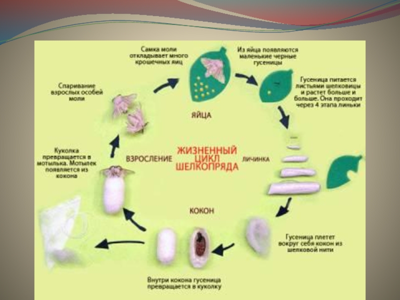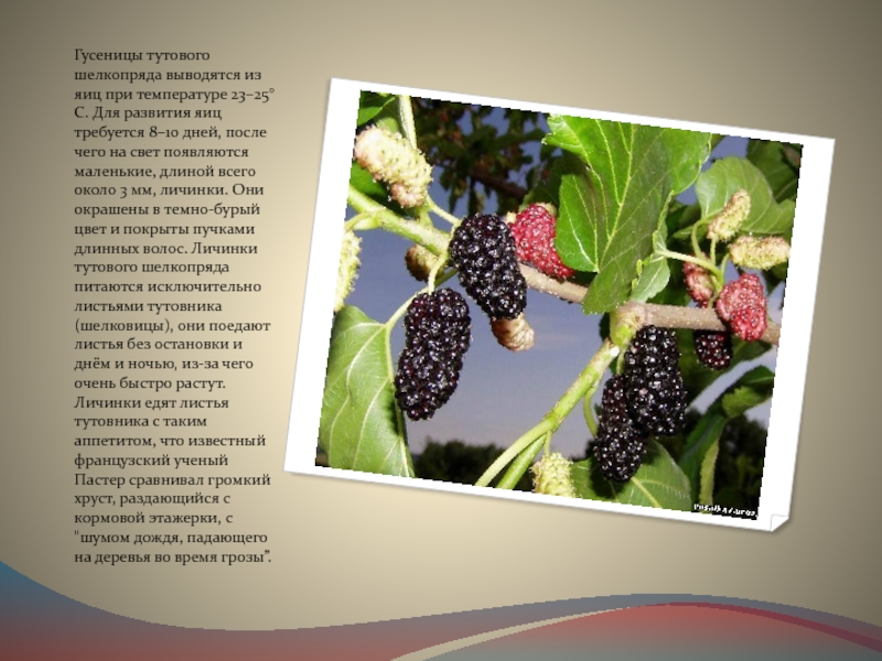Слайд 5Гусеницы тутового шелкопряда выводятся из яиц при температуре 23–25°С. Для развития