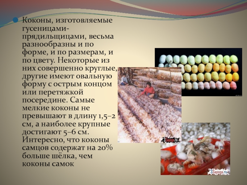 Слайд 10Коконы, изготовляемые гусеницами-прядильщицами, весьма разнообразны и по форме, и по размерам,
