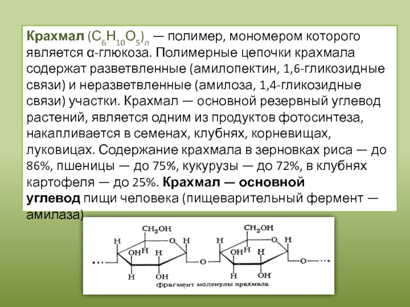 Слайд 14Крахмал (С6Н10О5)n — полимер, мономером которого является α-глюкоза. Полимерные цепочки крахмала содержат разветвленные