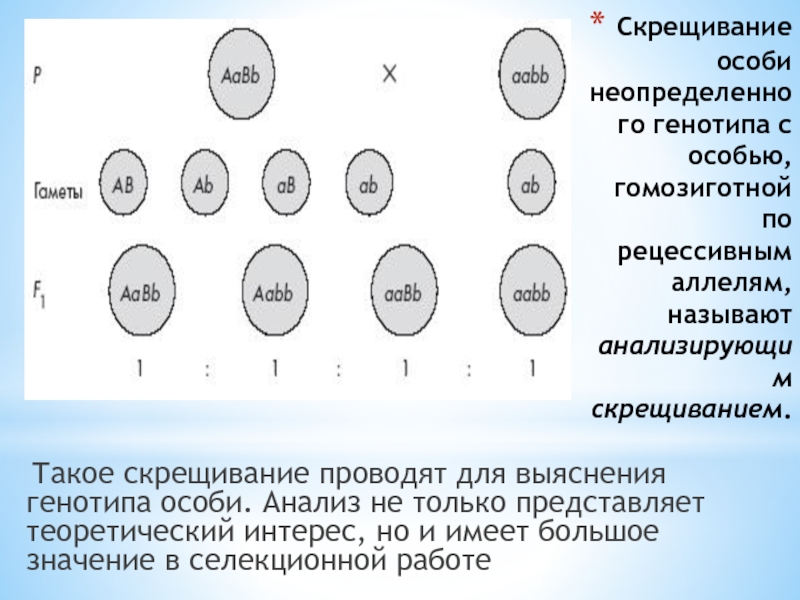 Такое скрещивание проводят для выяснения генотипа особи. Анализ не только представляет теоретический интерес, но и имеет большое значение в селекционной работе