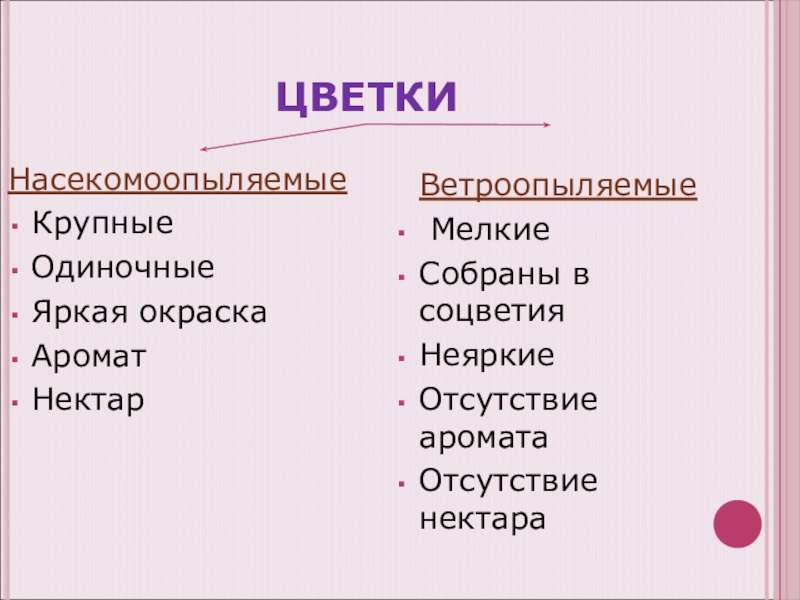 ЦВЕТКИНасекомоопыляемыеКрупныеОдиночныеЯркая окраскаАроматНектар    Ветроопыляемые МелкиеСобраны в соцветияНеяркиеОтсутствие ароматаОтсутствие нектара
