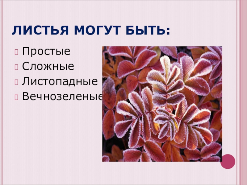 ЛИСТЬЯ МОГУТ БЫТЬ:ПростыеСложныеЛистопадныеВечнозеленые