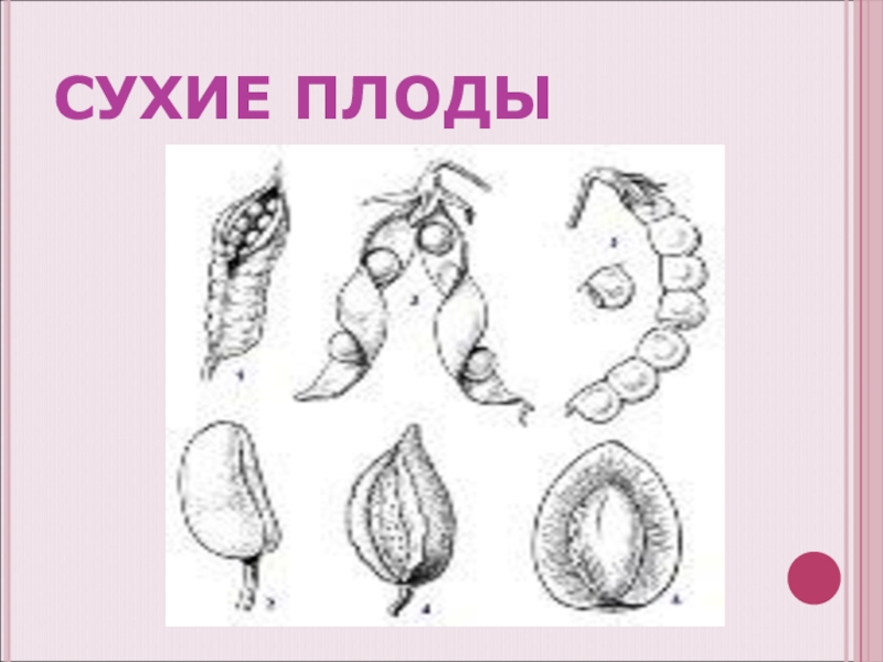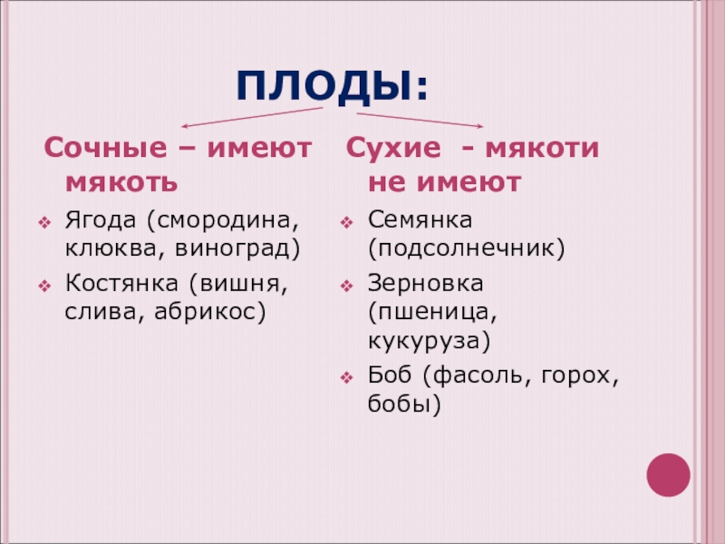 ПЛОДЫ:Сочные – имеют мякотьЯгода (смородина, клюква, виноград)Костянка (вишня, слива, абрикос)Сухие - мякоти не имеютСемянка (подсолнечник)Зерновка (пшеница, кукуруза)Боб