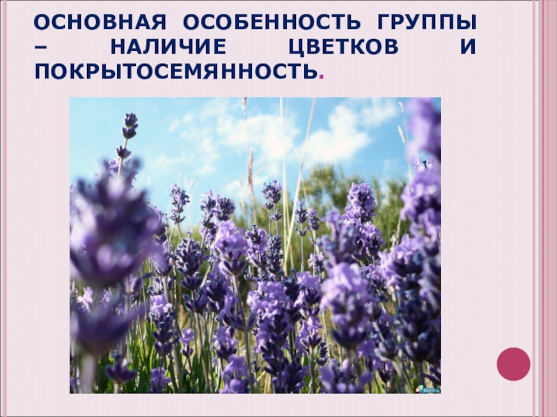Слайд 2ОСНОВНАЯ ОСОБЕННОСТЬ ГРУППЫ – НАЛИЧИЕ ЦВЕТКОВ И ПОКРЫТОСЕМЯННОСТЬ.
