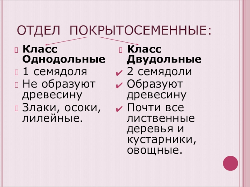 ОТДЕЛ ПОКРЫТОСЕМЕННЫЕ:Класс Однодольные1 семядоляНе образуют древесинуЗлаки, осоки, лилейные.Класс Двудольные2 семядолиОбразуют древесинуПочти все лиственные деревья и кустарники, овощные.