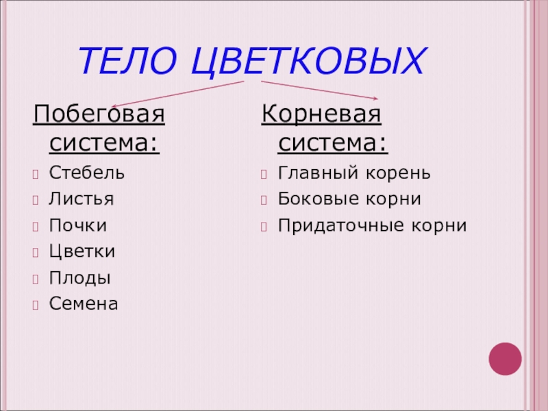 ТЕЛО ЦВЕТКОВЫХ Побеговая система:СтебельЛистьяПочкиЦветкиПлодыСемена Корневая система:Главный кореньБоковые корниПридаточные корни