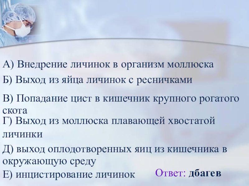 Д) выход оплодотворенных яиц из кишечника в окружающую среду