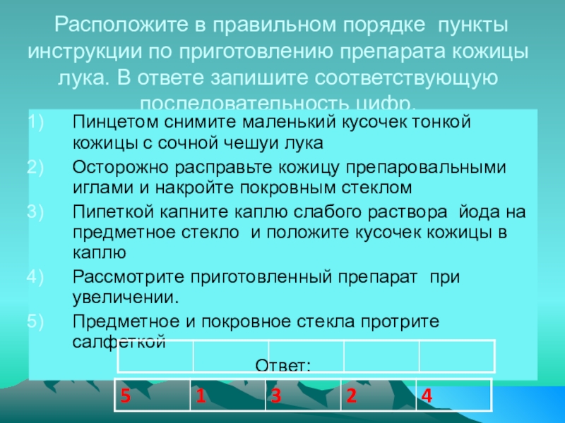 Пипеткой капните каплю слабого раствора йода на предметное стекло и положите кусочек кожицы в каплю