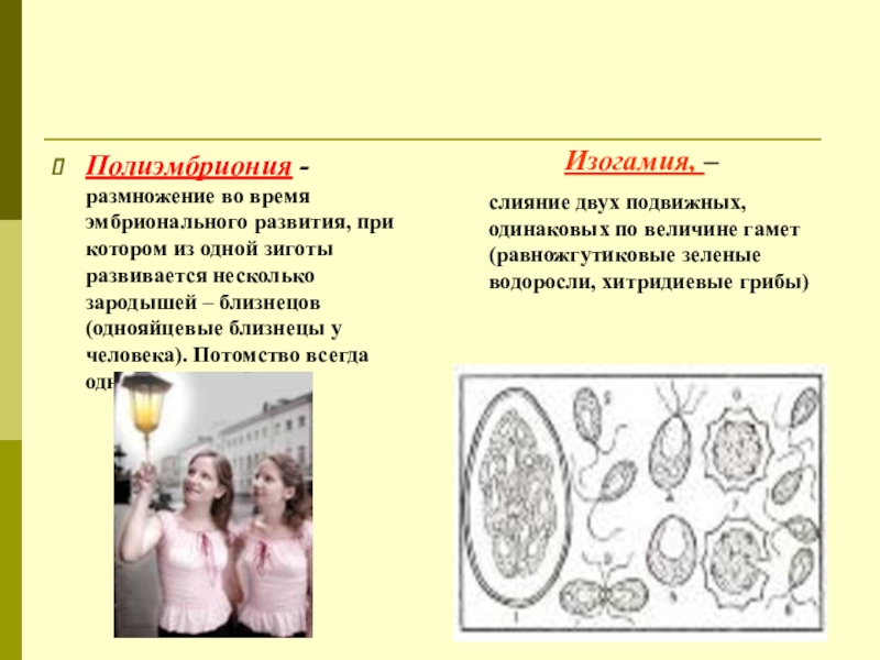 слияние двух подвижных, одинаковых по величине гамет (равножгутиковые зеленые водоросли, хитридиевые грибы)