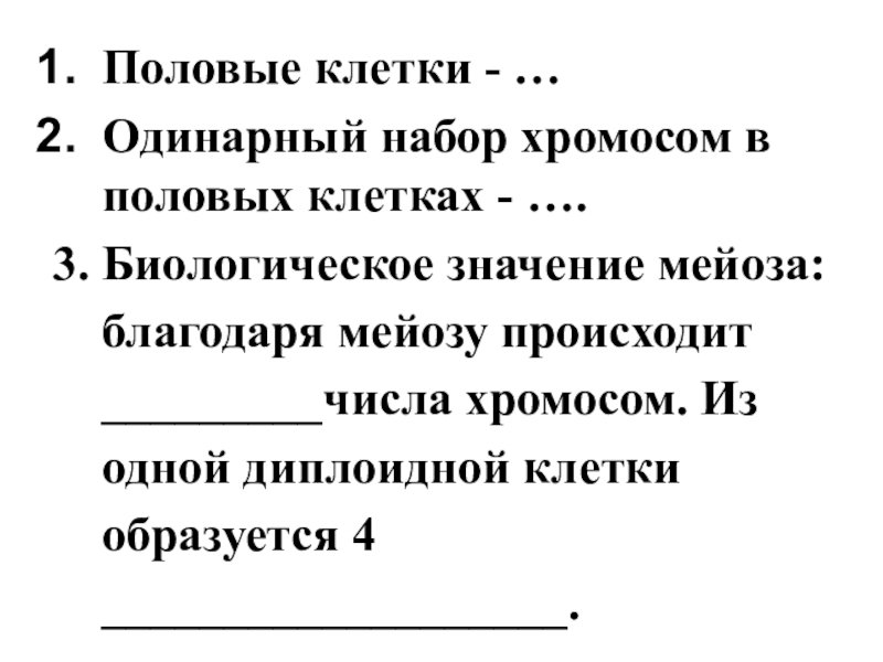 Половые клетки - …Одинарный набор хромосом в половых клетках - ….3. Биологическое значение мейоза: благодаря мейозу про­исходит