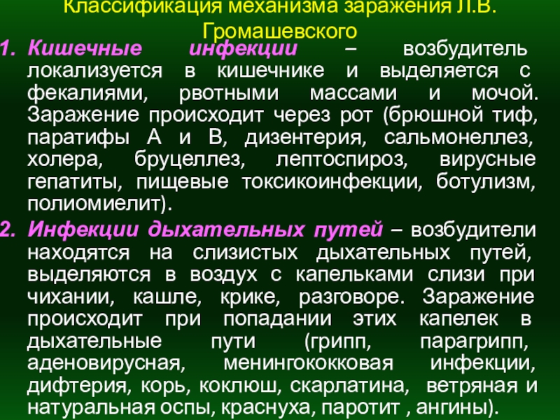 Слайд 24Классификация механизма заражения Л.В.Громашевского