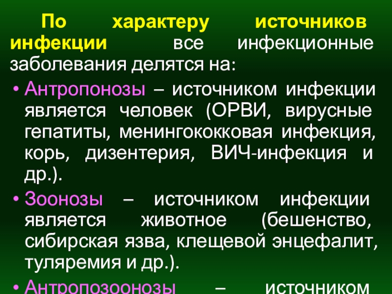 Слайд 18По характеру источников инфекции все инфекционные заболевания делятся на: