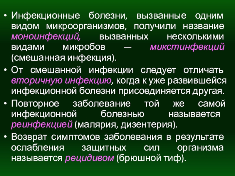Слайд 11Инфекционные болезни, вызванные одним видом микроорганизмов, получили название моноинфекций, вызванных несколькими