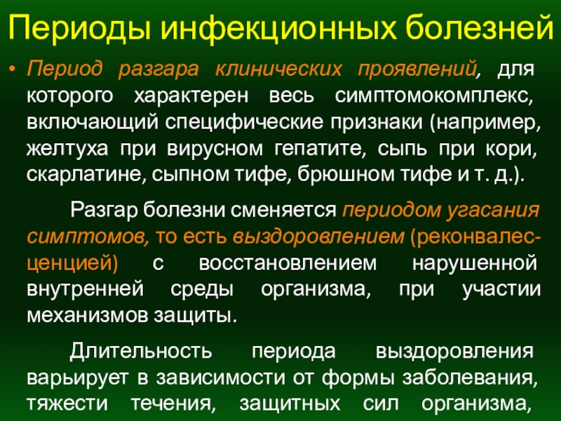 Разгар болезни сменяется периодом угасания симптомов, то есть выздоровлением (реконвалес-ценцией) с восстановлением нарушенной внутренней среды организма, при участии механизмов защиты.