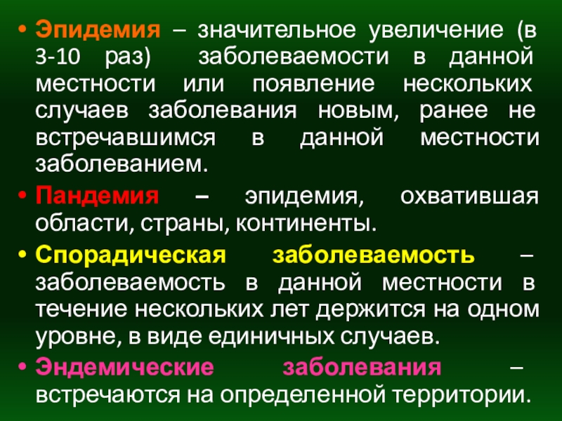 Слайд 15Эпидемия – значительное увеличение (в 3-10 раз) заболеваемости в данной местности