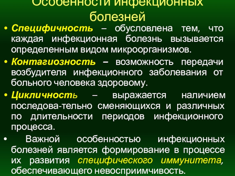 Важной особенностью инфекционных болезней является формирование в процессе их развития специфического иммунитета, обеспечивающего невосприимчивость.