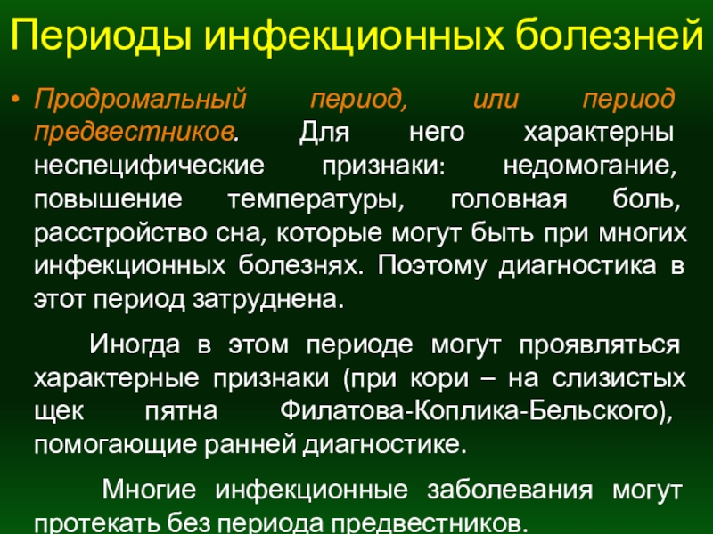 Иногда в этом периоде могут проявляться характерные признаки (при кори – на слизистых щек пятна Филатова-Коплика-Бельского), помогающие ранней диагностике.