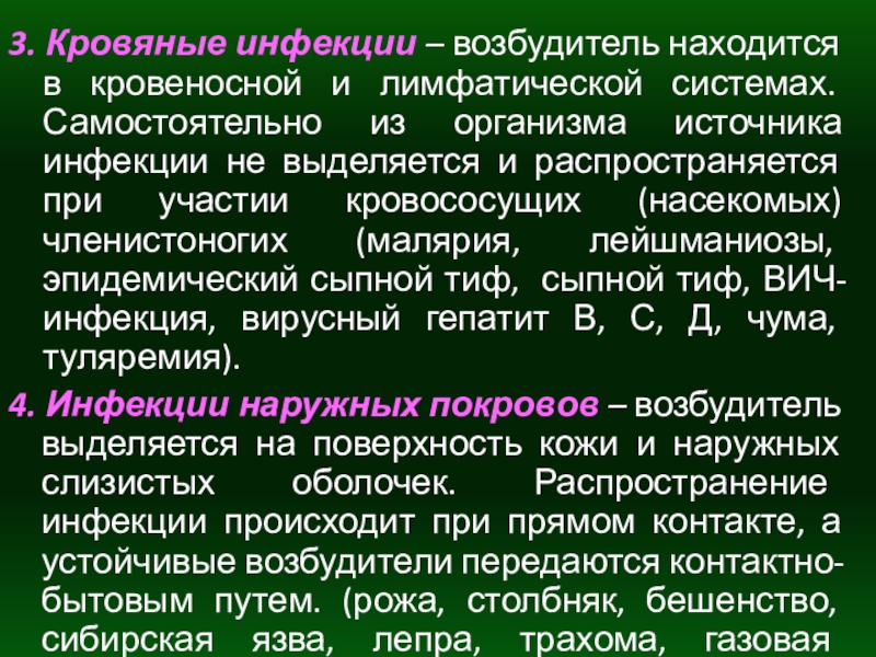 Самостоятельно из организма источника инфекции не выделяется и распространяется при участии кровососущих (насекомых) членистоногих (малярия, лейшманиозы, эпидемический сыпной тиф, сыпной тиф, ВИЧ-инфекция, вирусный гепатит В, С, Д, чума, туляремия).