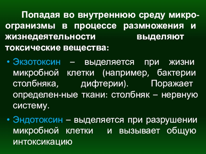Экзотоксин – выделяется при жизни микробной клетки (например, бактерии столбняка, дифтерии). Поражает определен-ные ткани: столбняк – нервную систему.